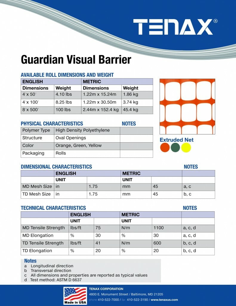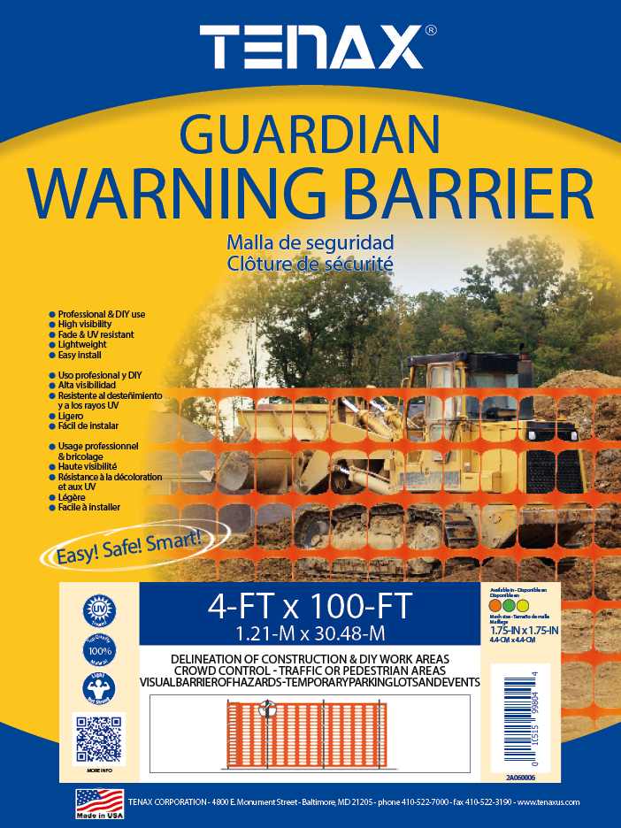 Tenax Guardian is a lightweight visual barrier suited for use around utility work, construction sites, or in crowd-control applications. Tenax Guardian is a highly noticeable warning barrier with oval mesh openings.