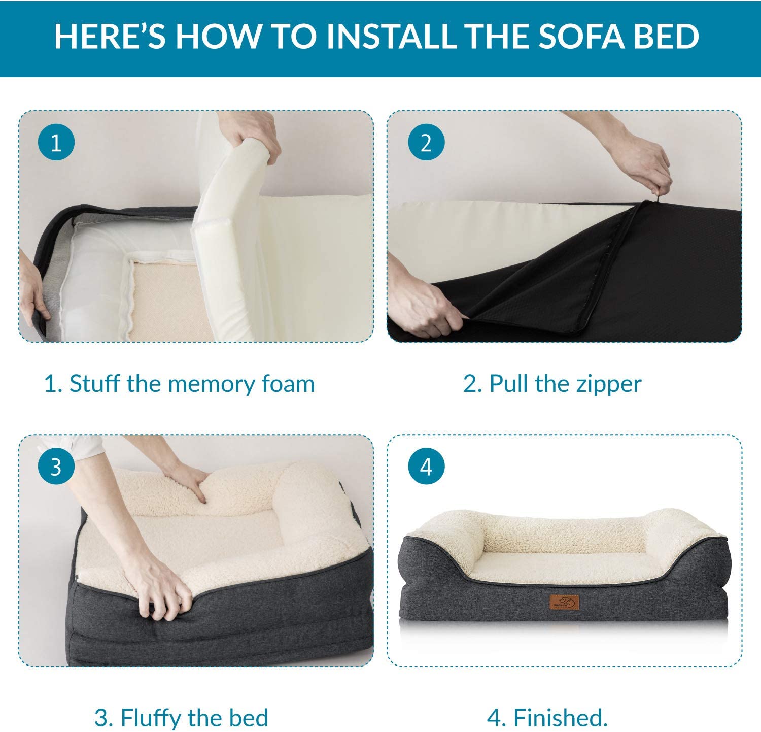 - SMART BED DESIGN: 3-sided pillow-like bolsters fit all your pet’s sleep positions to lay their heads on and is detachable for washing – 3-sided zipper on the outer cover makes it easier to remove or put together – Separate water-resistant liner (for the base) protects memory foam from any accidents – Non-slip bottom with rubber bits stays put on floors.